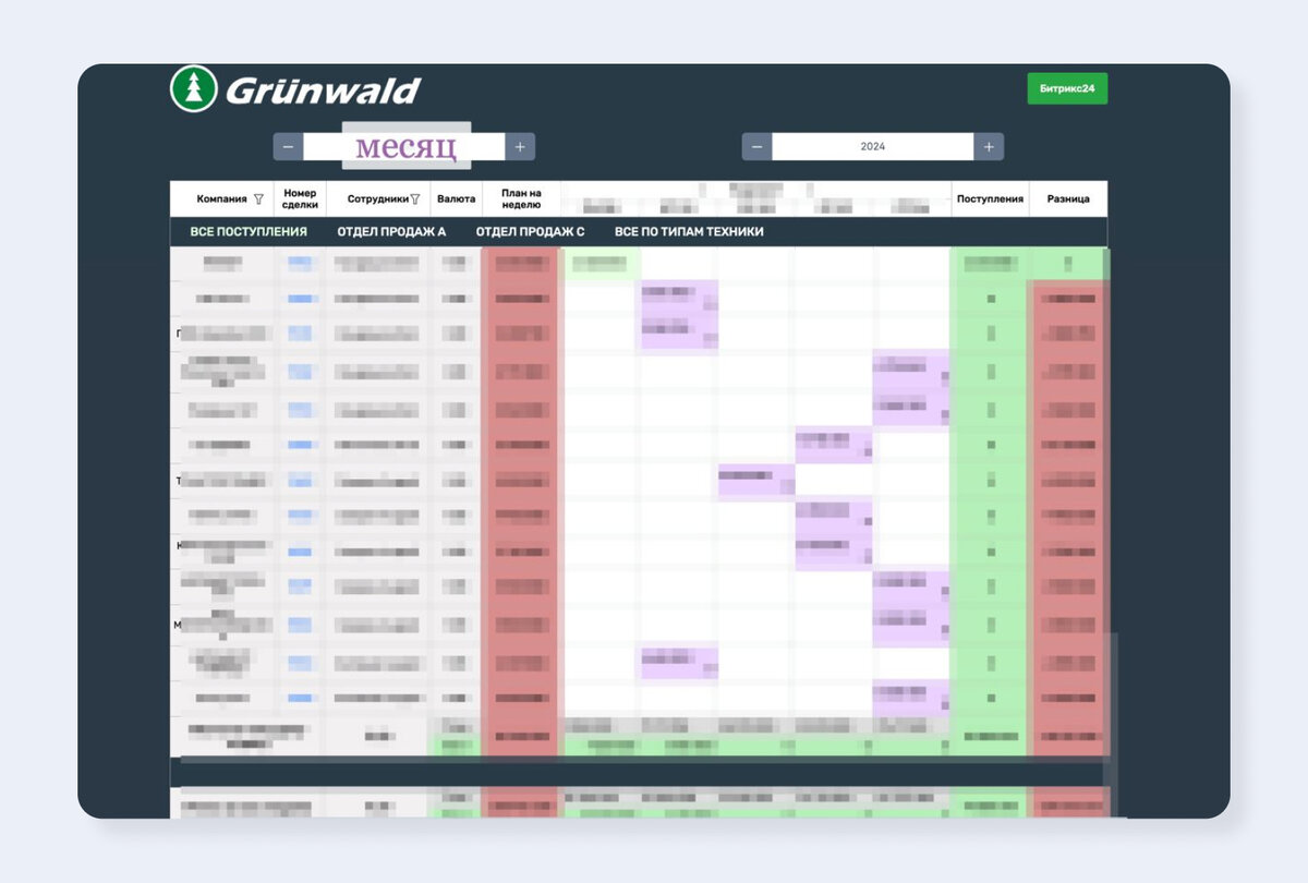 В отчете на едином экране выводятся все запланированные и фактические поступления в разрезе недели. Можно посмотреть данные в разрезе по отделам, сотрудникам и типам техники