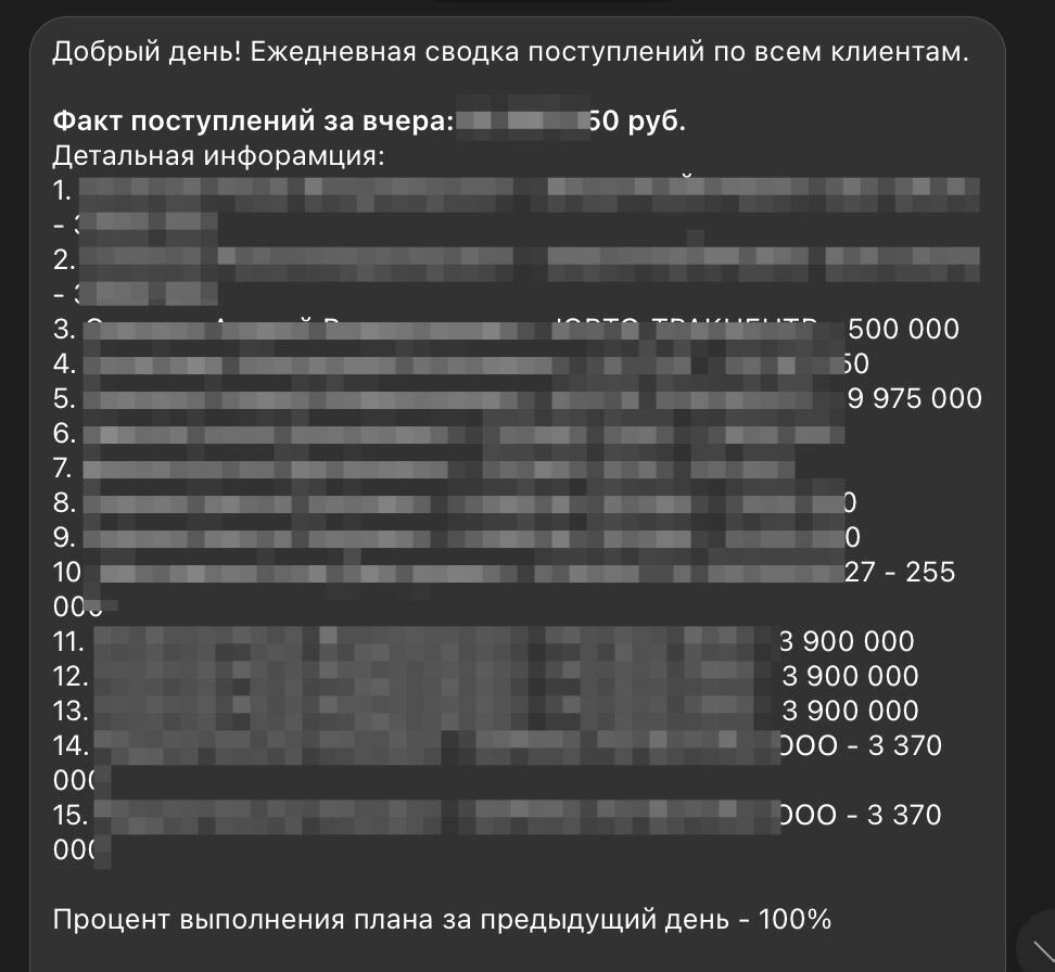 Каждый день, чат-бот отправляет руководителю факт поступлений за вчерашний день и план на сегодняшний с разбивкой по менеджерам. А менеджерам — такую же информацию по их клиентам.